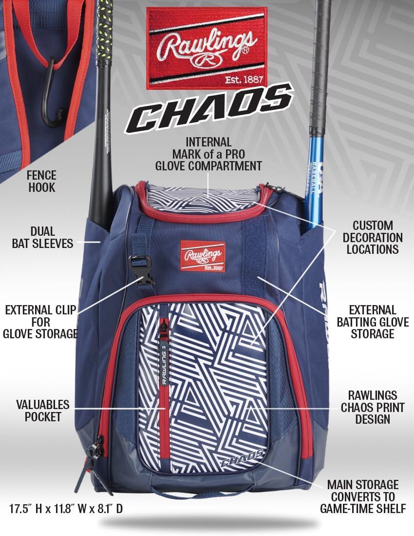 Rawlings | CHAOS Backpack Bag Series | T-Ball & Youth | Baseball & Fastpitch Softball | Multiple Colors(Red/White/Blue)