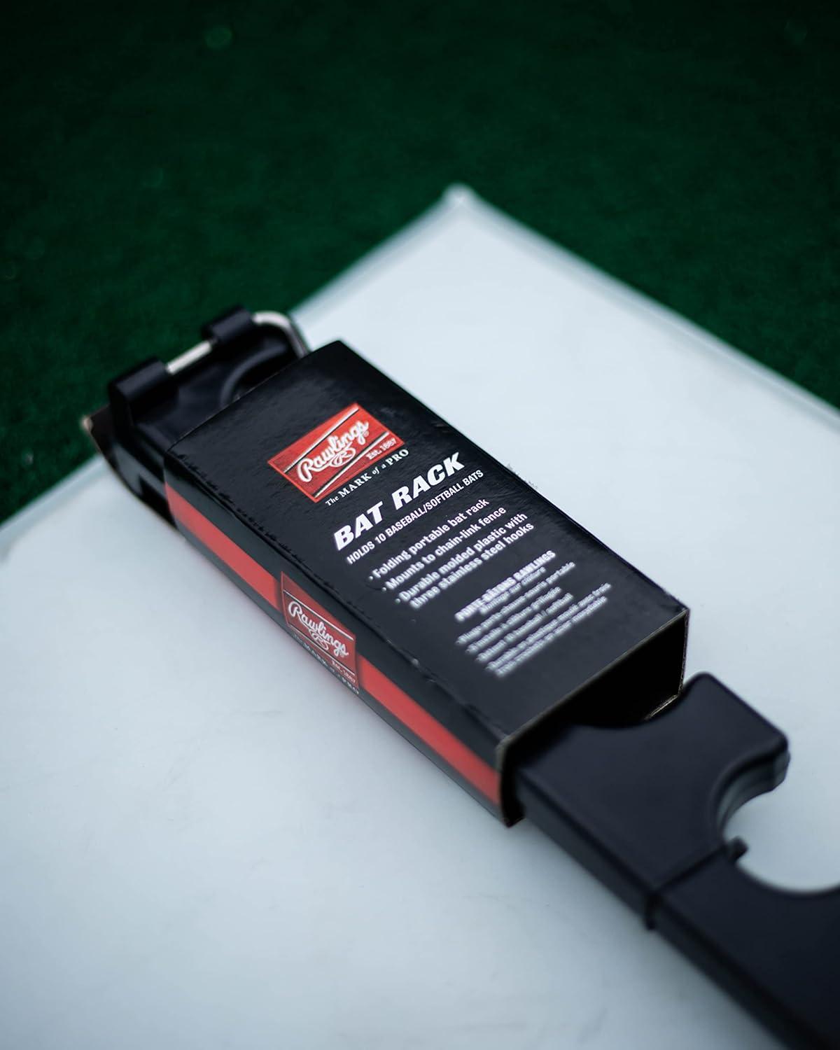 Rawlings Fence Bat Rack is a folding travel bat rack which mounts to chain link fence. It holds 10 baseball bats.