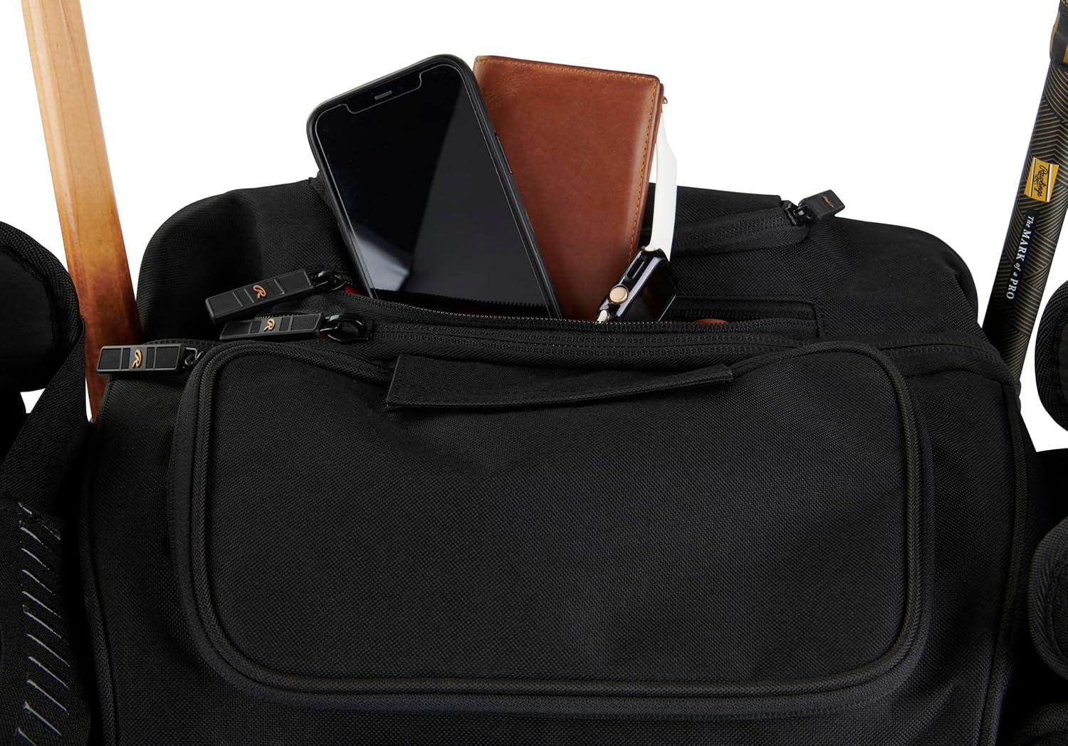 ORGANIZED GEAR STORAGE | Dedicated internal glove storage compartment, external leg guard storage, two (2) bat storage locations, and felt-lined accessories pockets keep your equipment organized and protected.