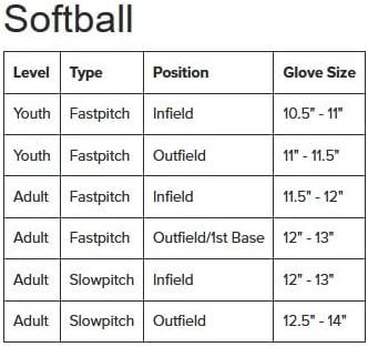 | Size | 11.5" | 1B Mitt | Ages 6 – 9, 12.5" | 1B Mitt | Ages 10 – 13, 31.5" | C Mitt | Ages 6 – 8, 32.5" | C Mitt | Ages 9 – 12 |
